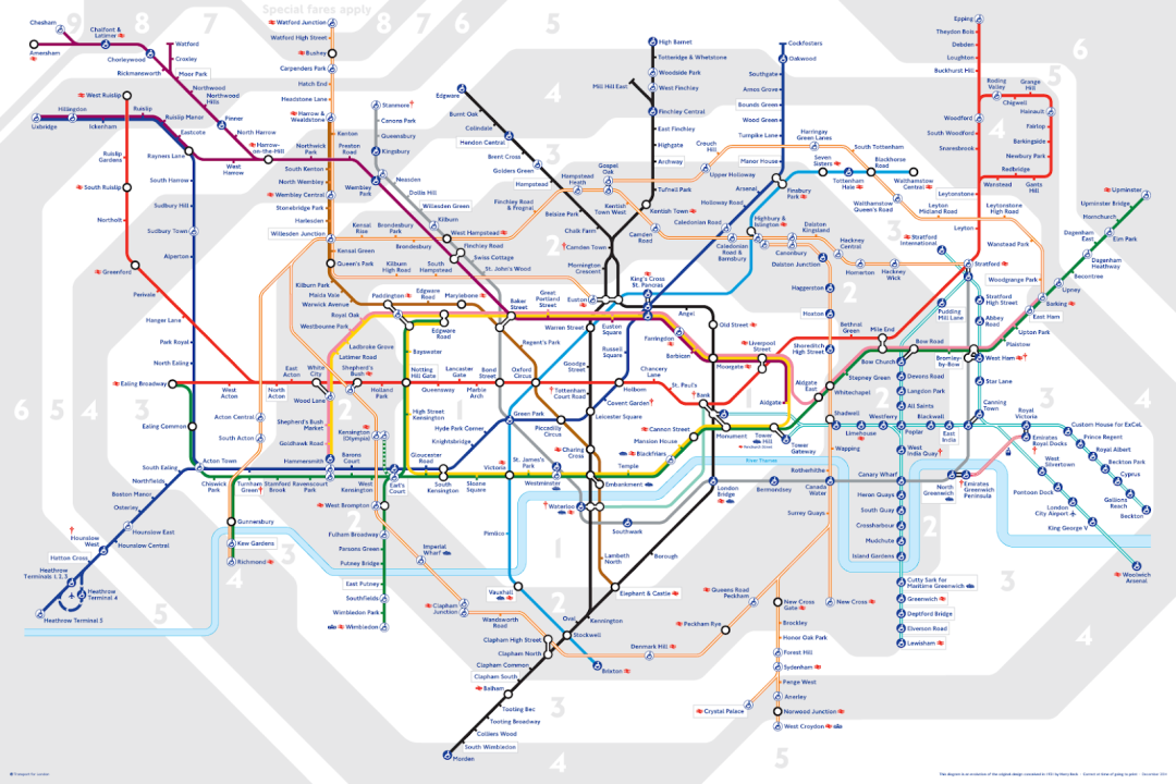 伦敦地铁地图(来源:伦敦交通局)。有趣的是,伦敦交通局最近部署了一个 基于图的数字孪生[6] 来改善事故响应并减少拥堵。