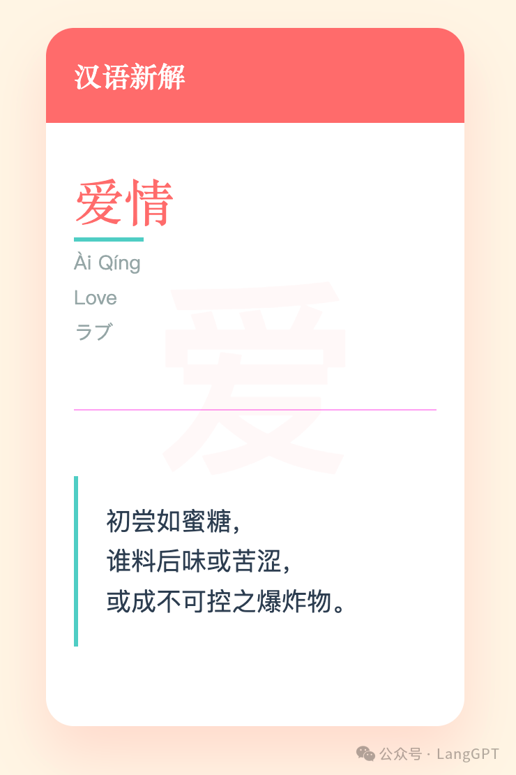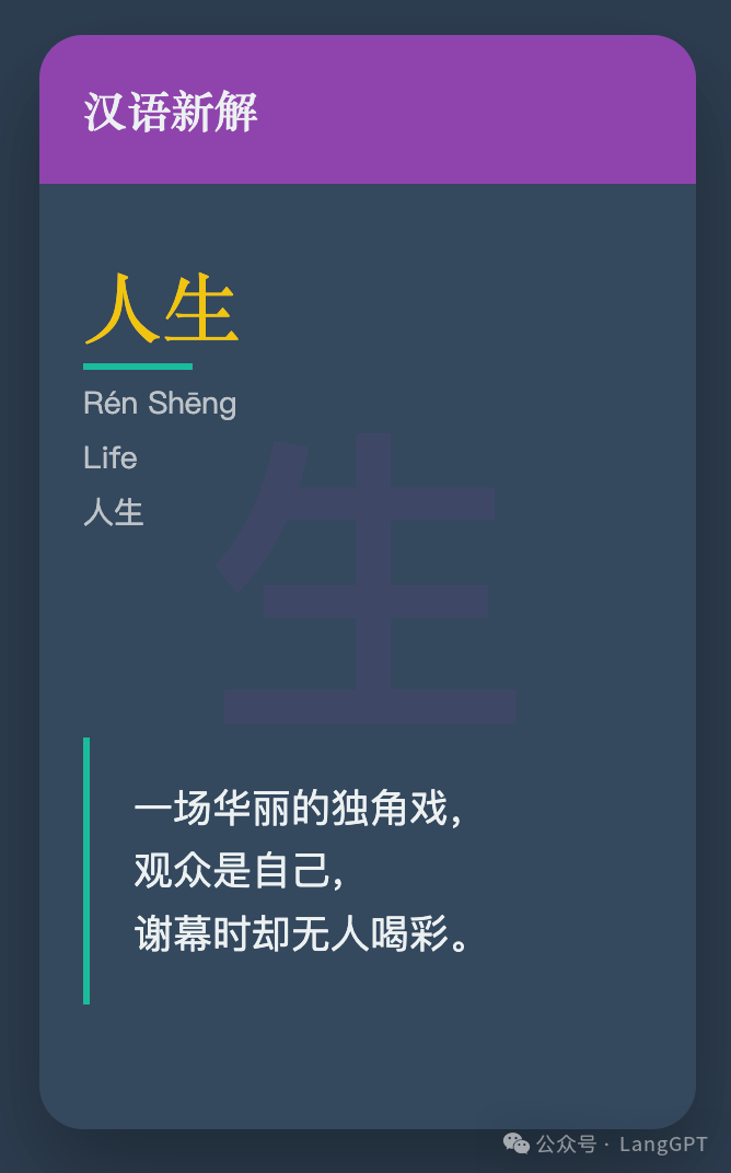 ‍‍有了这套提示词,只要给通义AI一个词,它就能自动生成一张精美的"汉语新解"卡片。