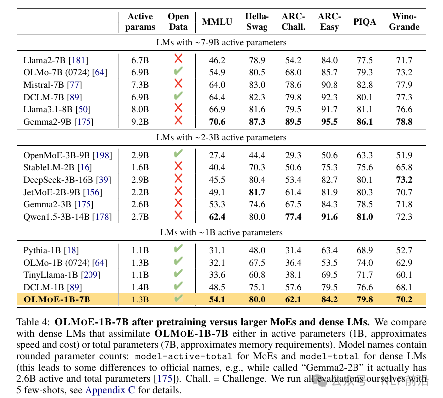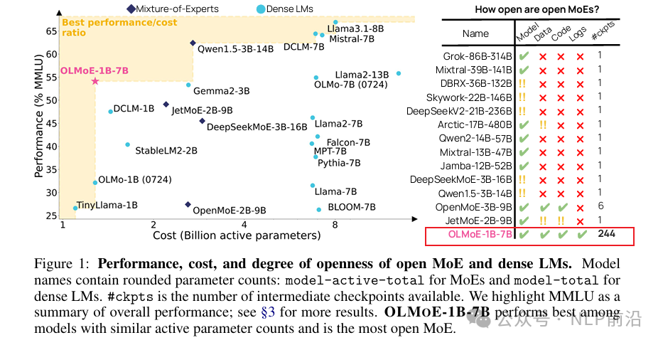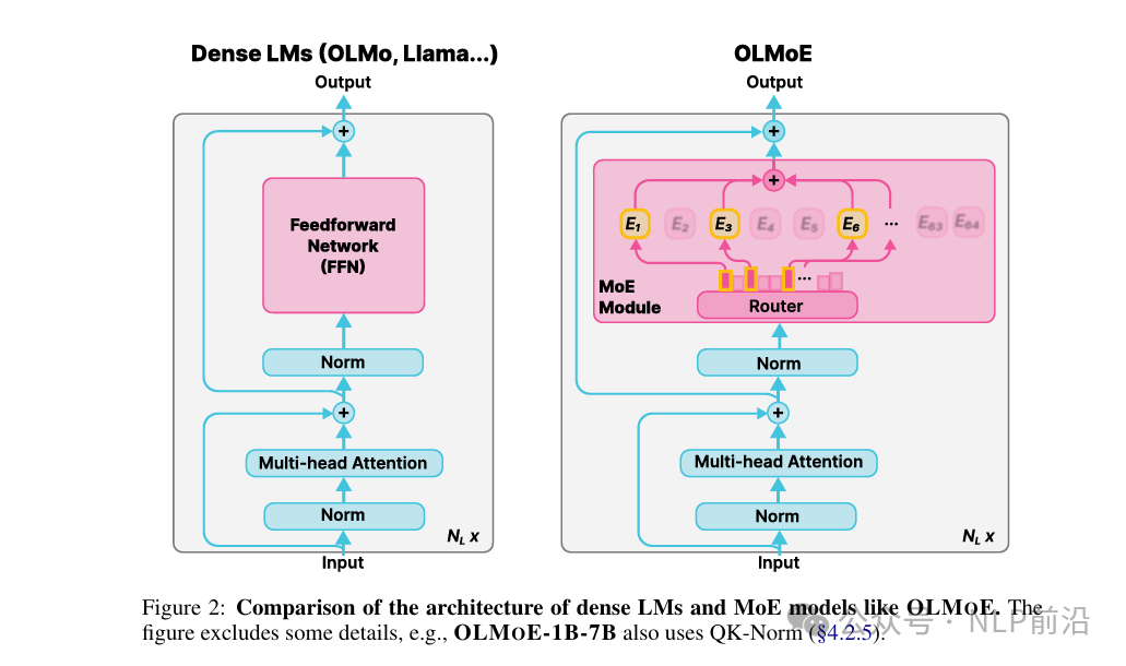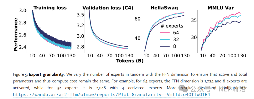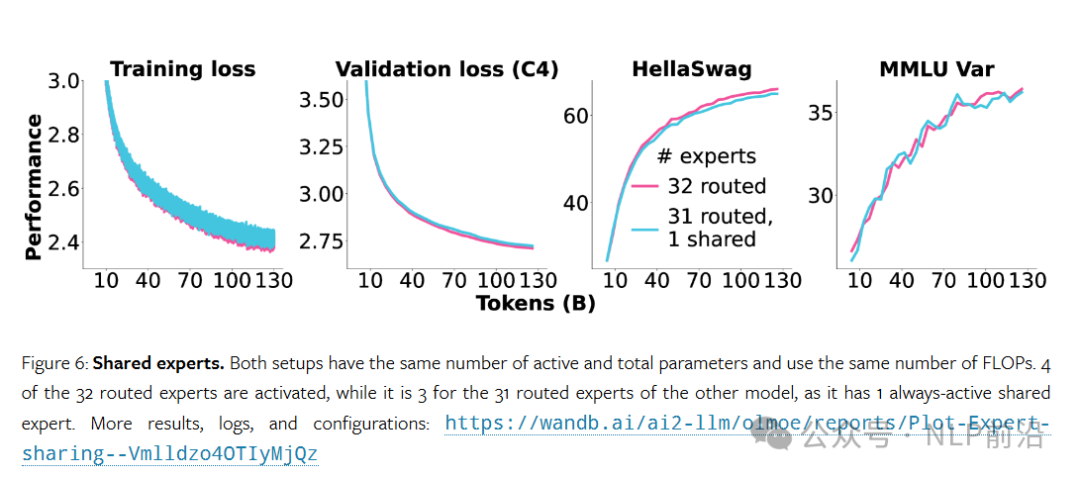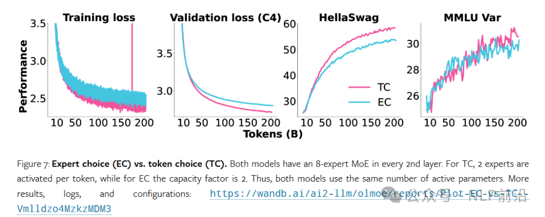 正常的MOE结构,用到了qk norm    全文61页,细节满满,感兴趣的同学可以自己看。这里简单提一些有意思的点~ 1B-7BMOE vs 1B / 7B dense起点更高,终点接近或超过7B全量全参dense的效果 更细粒度的专家组合可以得到更好的训练损失,但是收益递减。(这里提到了很多相关的研究,去做预测最优组合) 共享专家会消除模型的灵活性,让性能更差,与一些历史研究不符 确定哪些专家处理每个输入token ,有2种类型 - EC,每个专家从输入序列中选择固定数量的token。(确保完美的负载平衡,但是不利于自回归的生成模式,也可能导致token丢失)