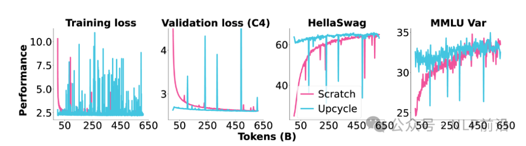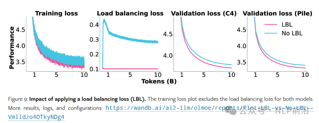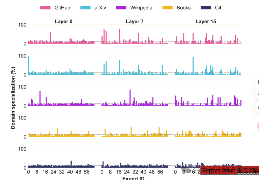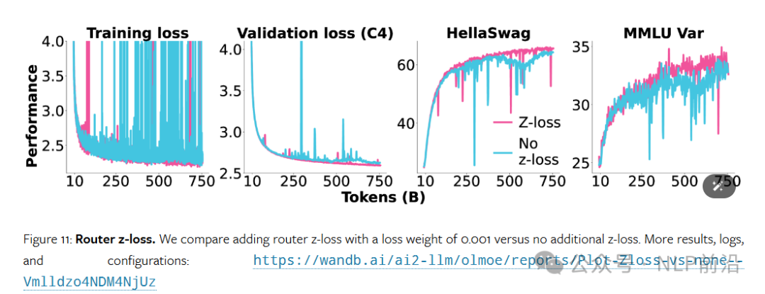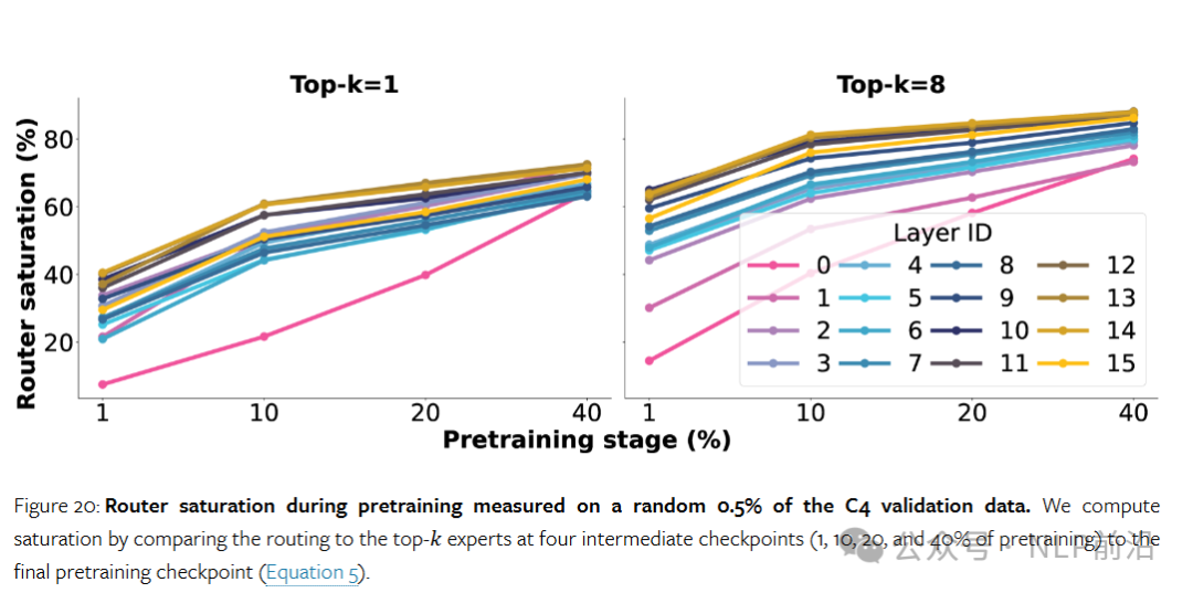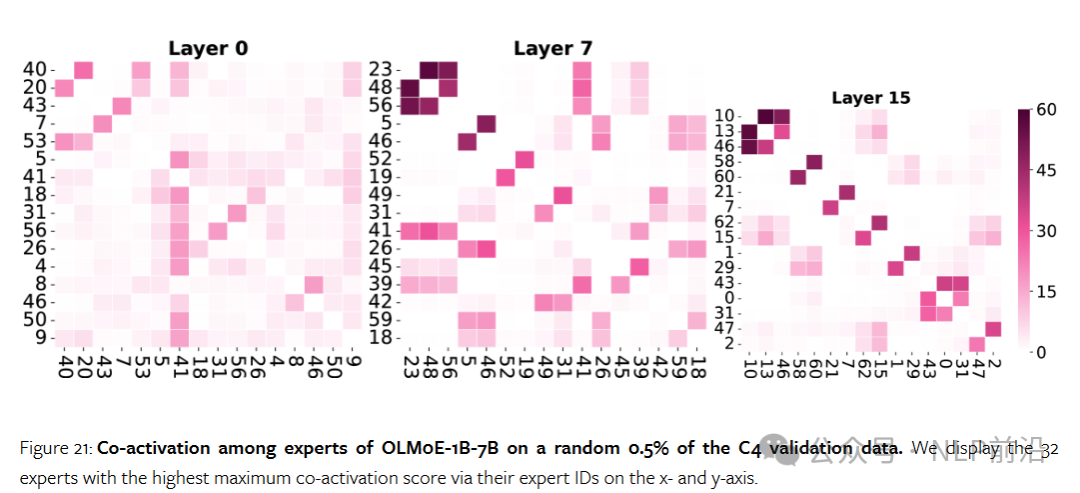 相同的预算下,TC稳定优于EC 专家是从头初始化,还是从MLP复制得到。实验发现只需要几百B的token,从头开始的模型就赶上了复制的结果,从600B token之后优于复制的结果。 使用负载平衡损失也能带来更好的性能  路由z-loss可以提高MoE模型的稳定性和质量。这个辅助损失会惩罚进入门控网络的大logits  预训练的早期阶段路由就达到了饱和状态 训练结束后,通一层的专家之间不存在强协同激活,也就是说不同专家之间几乎没有冗余 专家对于特定领域和词汇的专业化程度区分度还是比较高的。某些专家可能专门处理一些科学相关的,(如arXiv数据集),而其他专家可能更擅长处理编程语言或一般文本。