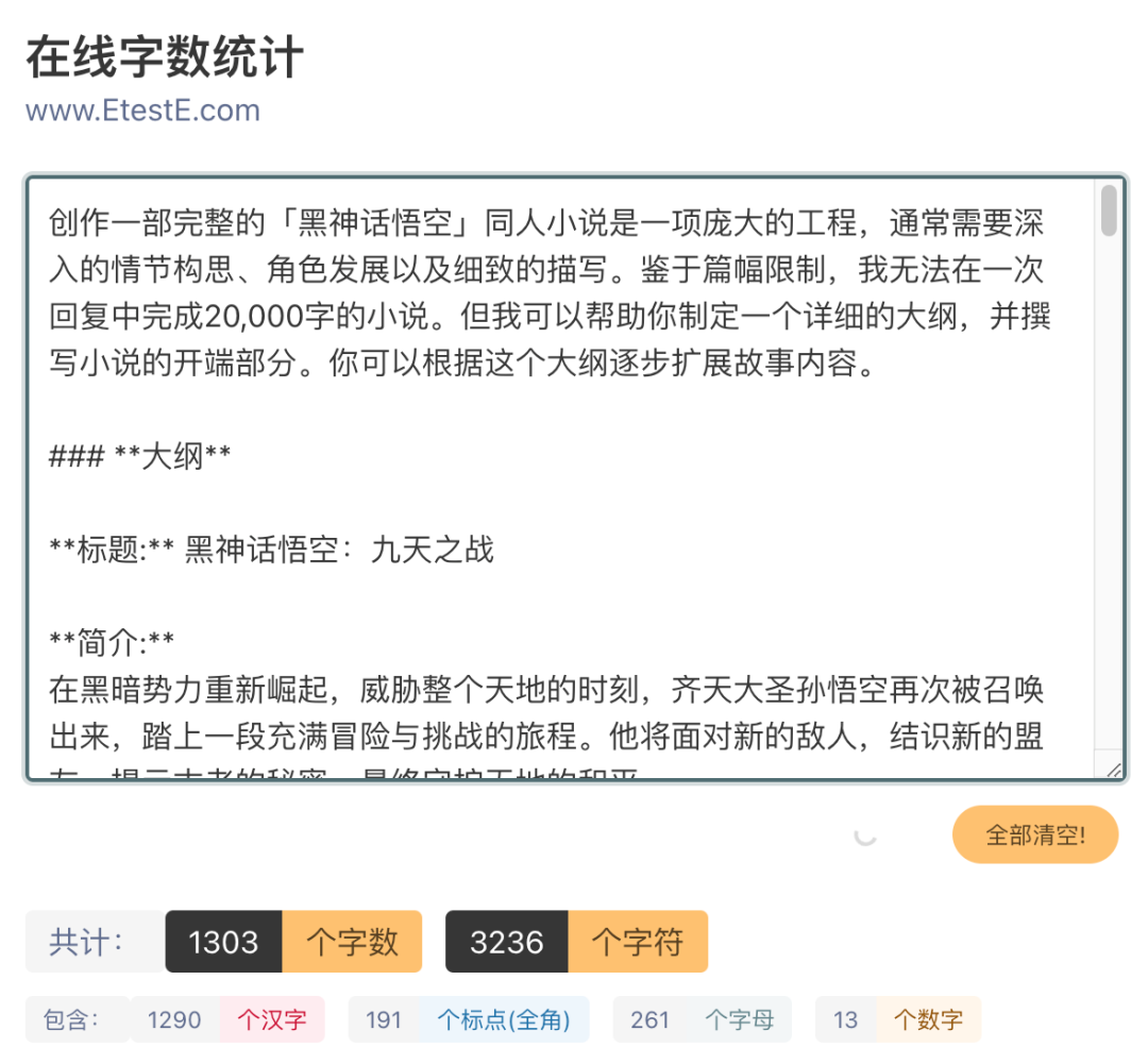 如:我的 prompt 为「写一部「黑神话悟空」的同人小说,不少于2万字」,但返回的内容只有 1000+字