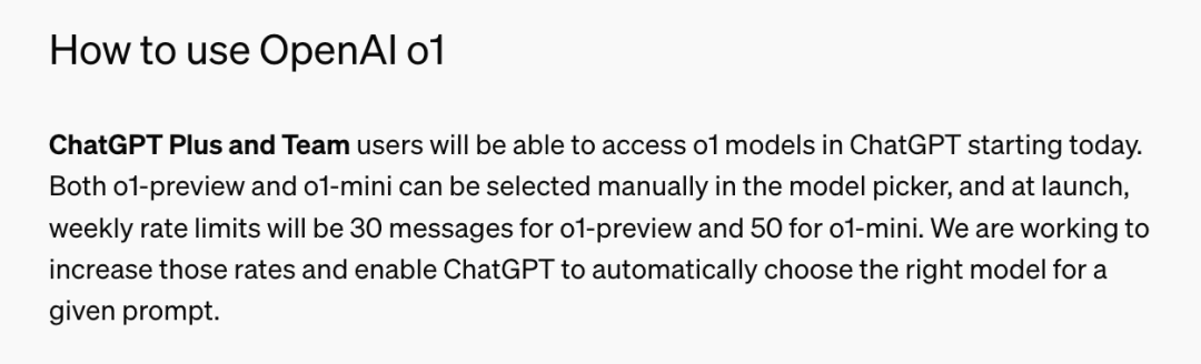 Plus 和 Team 的用户可在 ChatGPT 中访问,o1-preview 限制在了 30 条/周,o1-mini 限制在了 50 条/周