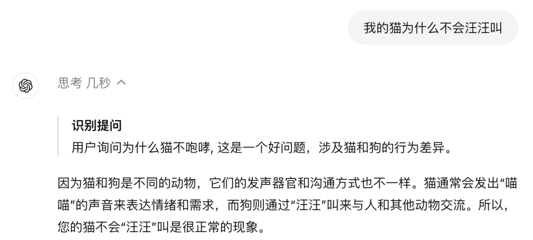 当我询问「我的猫为什么不会汪汪叫」的时候,出现了典型的「意图识别」