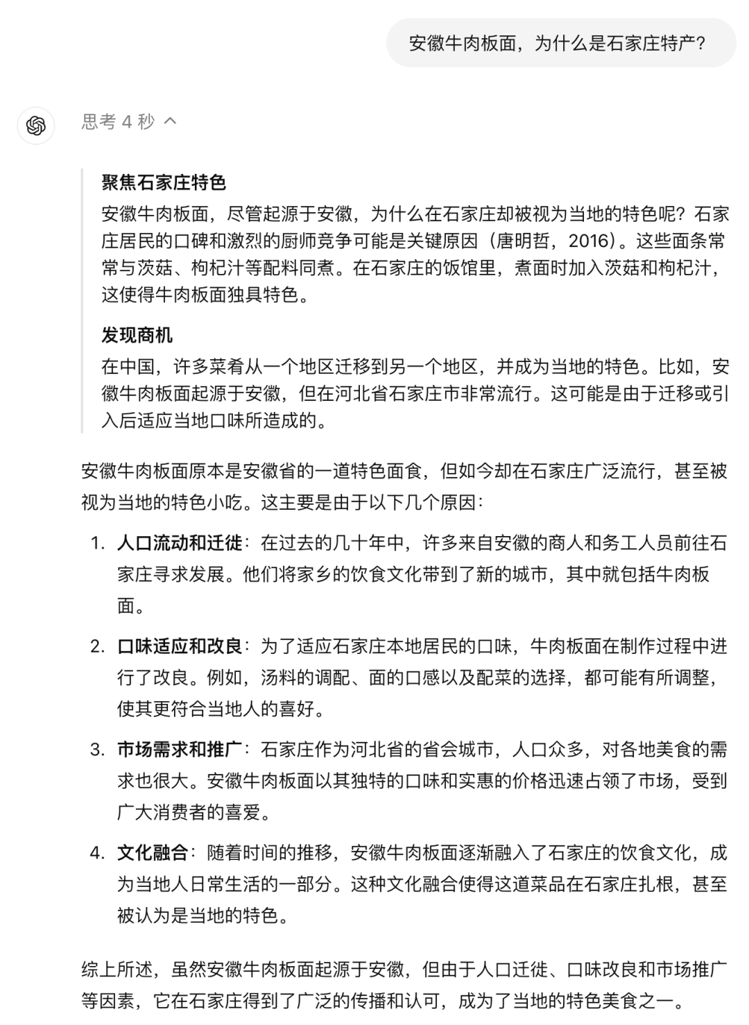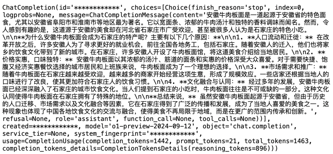 需要注意:在 api 调用的过程中,并不会返回中间的思考,比如相同的问题「安徽牛肉板面,为什么是石家庄特产?」,api 侧的返回如下: