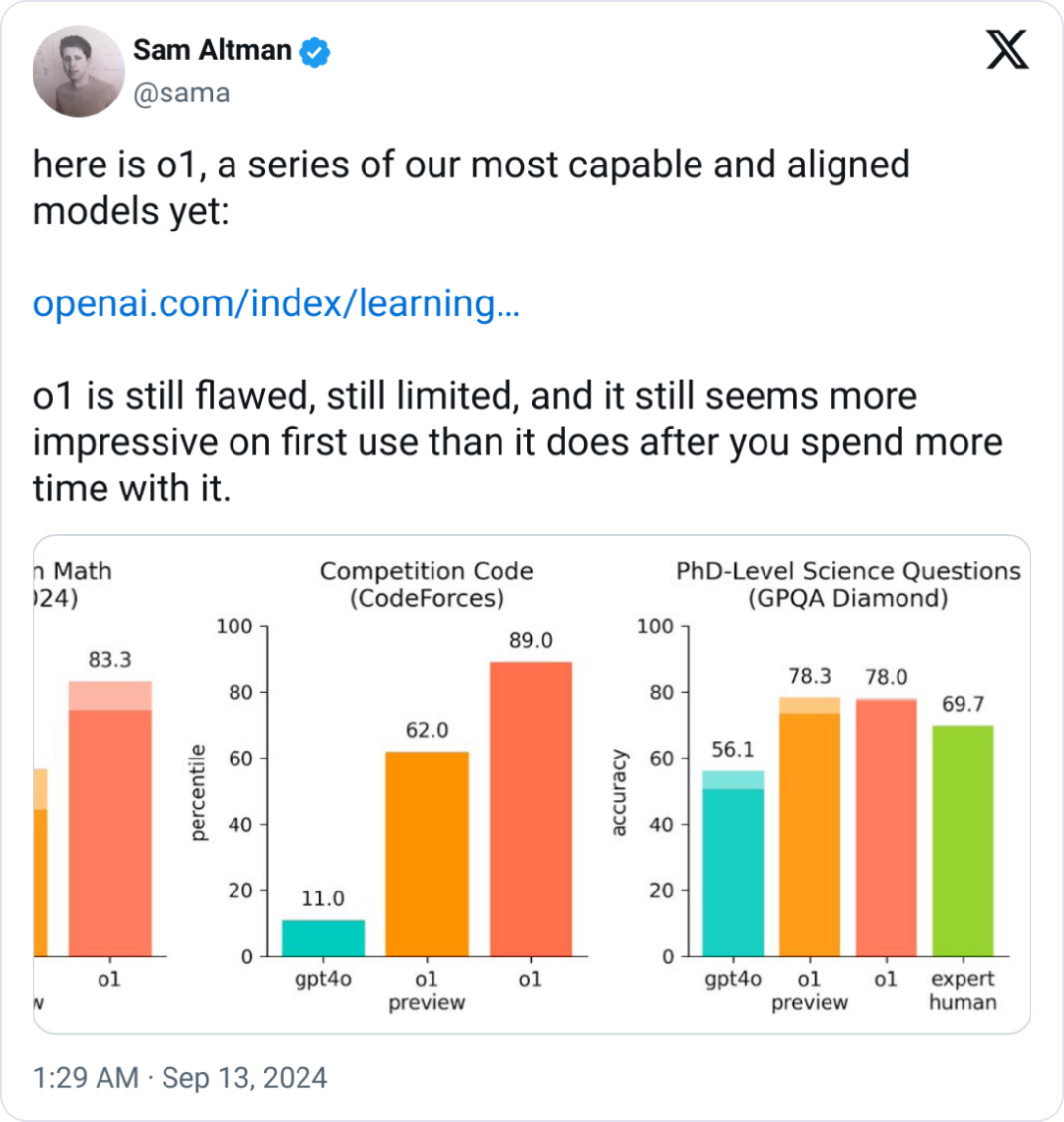 从 OpenAI 公布的数据来看,o1 在STEM(理工科)领域进行了特别优化,在回答之前会进行思考。在物理、生物和化学问题(GPQA)的基准测试中超越了人类博士水平的准确性。
