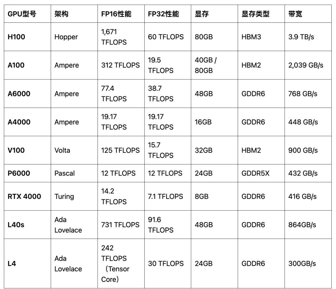 这个表格总结了每个GPU的架构、FP16/FP32计算性能、Tensor Core性能、显存大小、显存类型以及内存带宽,便于比较各个GPU在不同任务场景中的适用性。按照架构来讲,越新的架构肯定性能相对更好,这些架构从旧到新依次是: