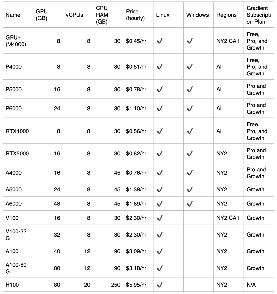 在这里,我们比较的不仅仅有早期发布的 GPU,还有现在比较前沿的 GPU,比如 H100。像 H100 这种 GPU 实际上既适合做模型训练,也适合做推理,但是 H100 的成本会比较高,性能也比较好,如果用在推理方面难免有些大材小用。所以我们以上给出的结论都是基于指标层面的,实际上大家还需要结合成本来看。大家可以参考 DigitalOcean 旗下 Paperspace 的 GPU 云服务定价来看,单卡GPU 实例的价格如下: