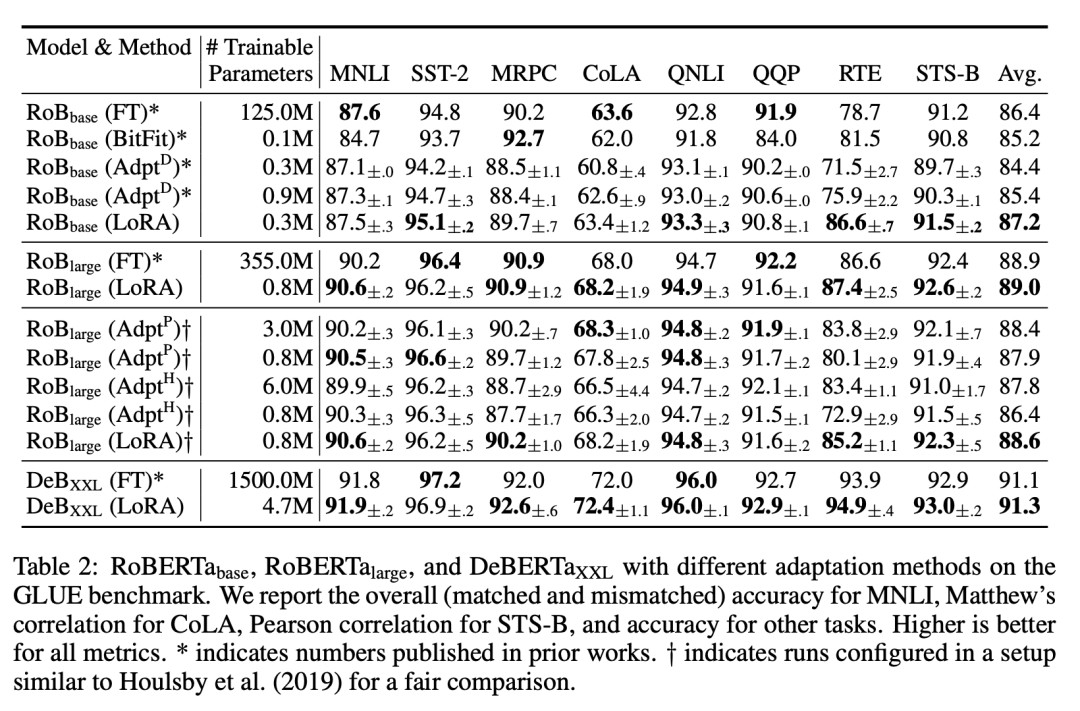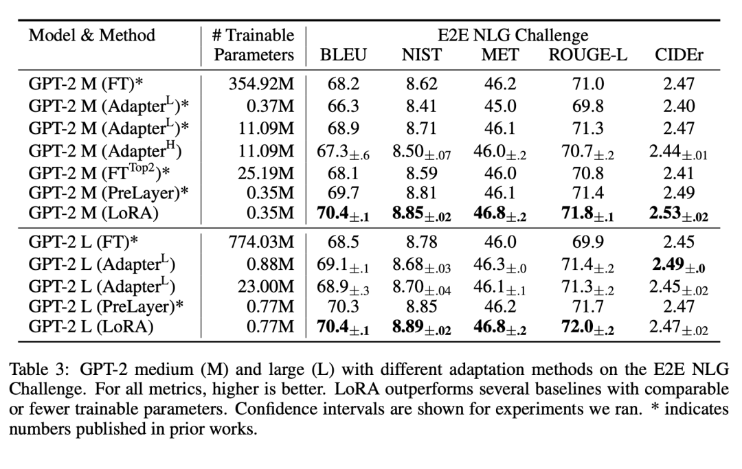 • 使用LORA进行微调相比全参数微调(Fine-Tuning),能够显著降低参数量,且与现有的高效参数微调方法持平甚至更低。