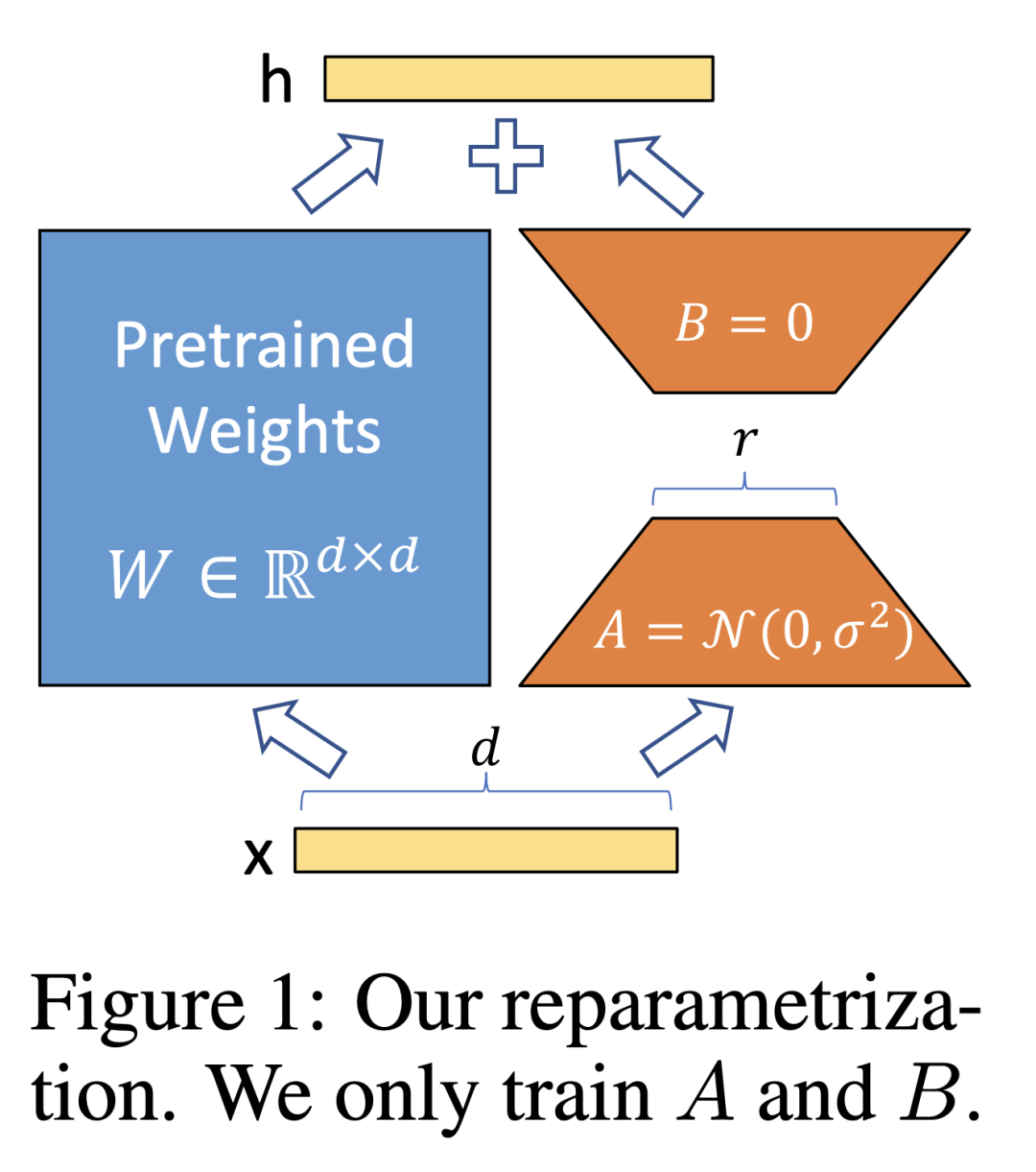 使用随机高斯分布初始化降维矩阵A ,而升维矩阵B则初始化为零矩阵,确保训练开始时BA矩阵保持为零矩阵。