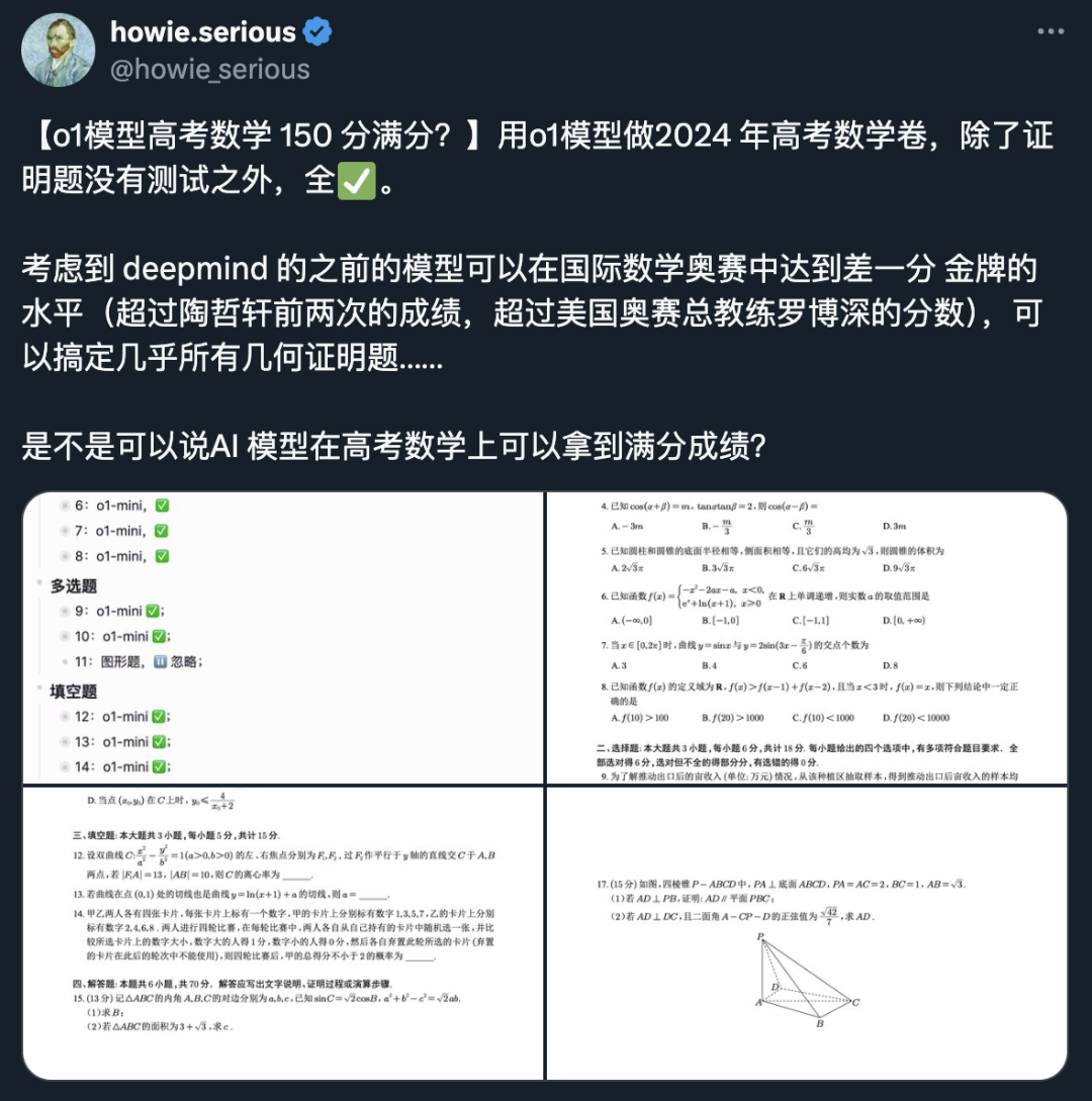 模型智能水平更有说服力的证据,是网友@howie_serious用 o1 测试今年的数学高考题,结果竟然全对。