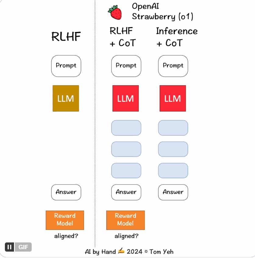 但官方报告对 o1 的技术架构和训练方法基本没有明确的说明,只是提及了强化学习(Reinforcement Learning,RL)和思维链(Chain of Thought,CoT)这两个关键词: Through reinforcement learning, o1 learns to hone its chain of thought and refine the strategies it uses. It learns to recognize and correct its mistakes. It learns to break down tricky steps into simpler ones. It learns to try a different approach when the current one isn't working. 通过强化学习,o1 学会了磨练其思维链条并优化所使用的策略。它学会了识别并纠正自己的错误。它学会了将复杂的步骤分解为更简单的部分。它学会了在当前方法行不通时尝试不同的途径。 Tom Yeh 猜测 o1 训练和推理时的方式如下,并简单解释了其与传统 RLHF 的不同: