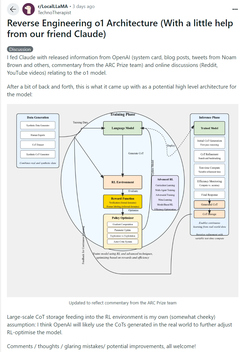 Reddit 上的大神则综合 OpenAI 所有的公开信息,与 Claude3.5 “讨论”出了一个 o1 的可能架构,也算是“尝试魔法破解魔法”: