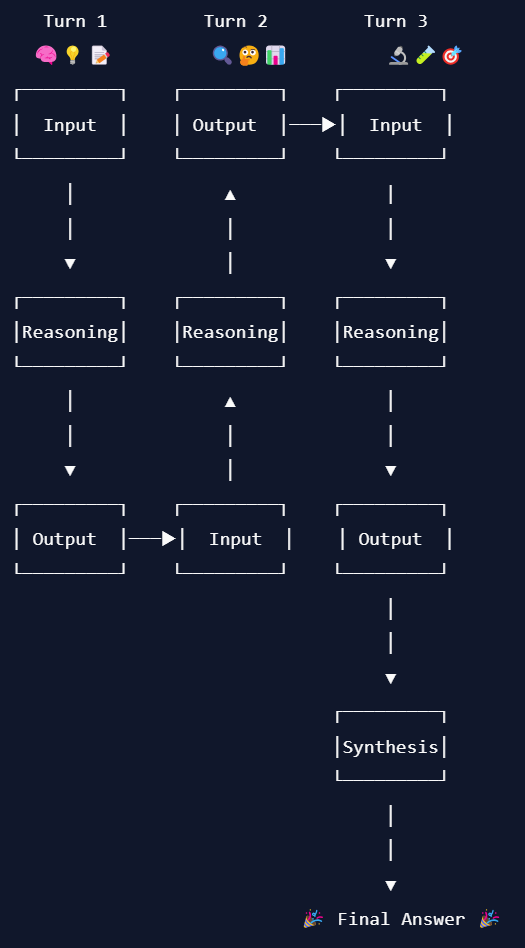 经过三轮思考之后,再让 AI 检视其所有思考并得出一个合理的最终答案。这就像是让专家讨论问题,然后编写最终报告。