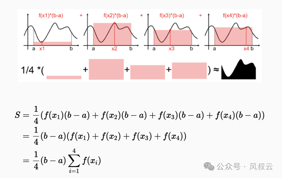 蒙特卡罗方法的解法如下:在[a, b]之间取一个随机数 x,用 f(x)⋅(b−a) 来估计阴影部分的面积。为了提高估计精度,可以取多个随机数 x,然后取这些估计值的平均值作为最终结果。当取的随机数 x 越多,结果将越准确,估计值将越接近真实值。