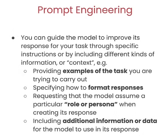 Prompt Engineering 是一种技术,允许你通过特定指令或包含不同类型的信息(即"上下文")来引导模型改善其对你任务的响应。有几种方法可以实现这一点: