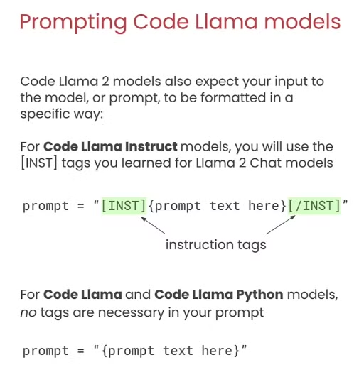 需要注意的是,对于Code Llama Instruct模型是需要加入tags的,但是对于Code Llama和Code Llama Python模型是不需要的。