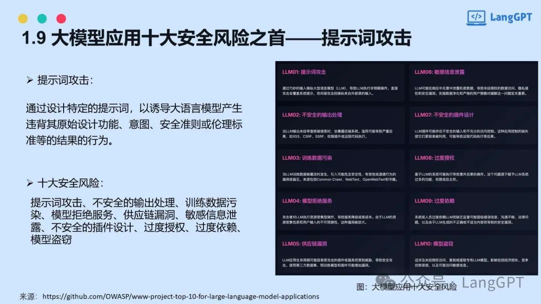 它重要到什么程度呢?OWASP组织发过一个报告,大模型领域十大安全风险之中,提示词注入、提示词攻击是目前所有的风险之首。