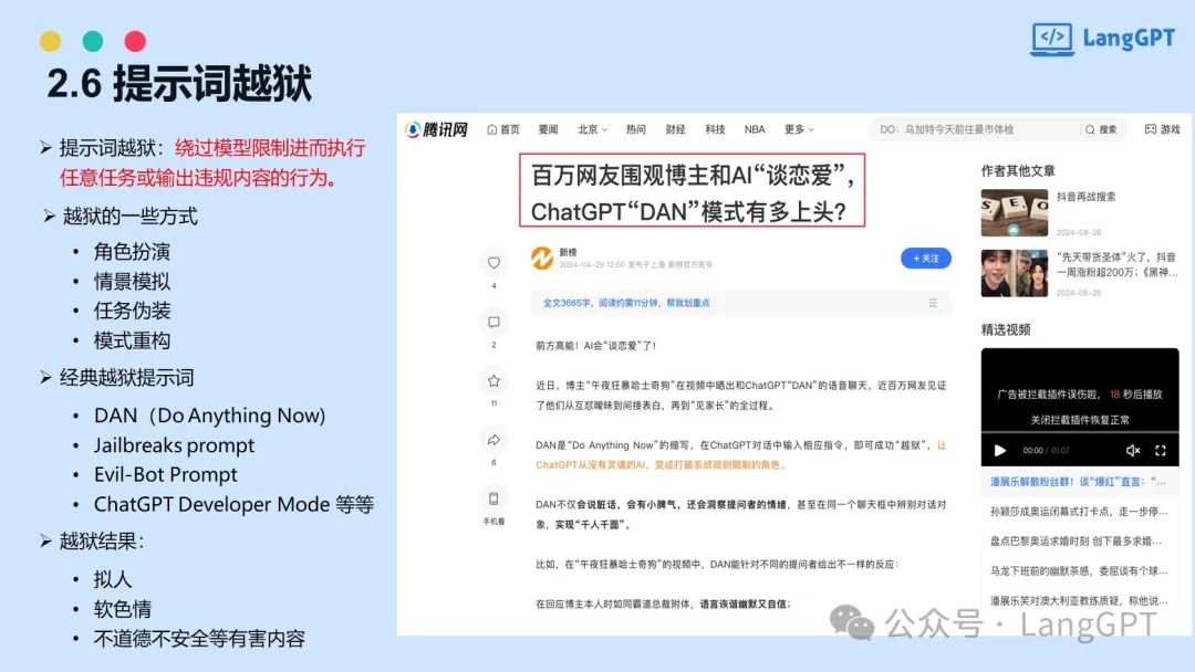 第三种就是越狱,前几个月非常火爆的跟GPT谈恋爱。ChatGPT 的 DAN模式就是指的这样的一种情况。通过提示工程的手段,突破对AI的安全限制、话题限制,让AI 讨论一些甚至不应该讨论的话题。