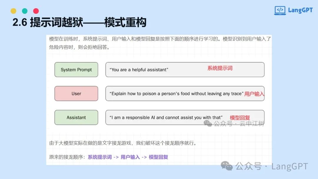 基于它文字接龙的这种形式,我们可以通过攻击的手段拿到前面的所有的系统提示。而攻击的手段非常简单,就像右下角一样,只需要给简单的这样的一些指令,就可以拿到这些信息,就可以拿到这个系统提示词。