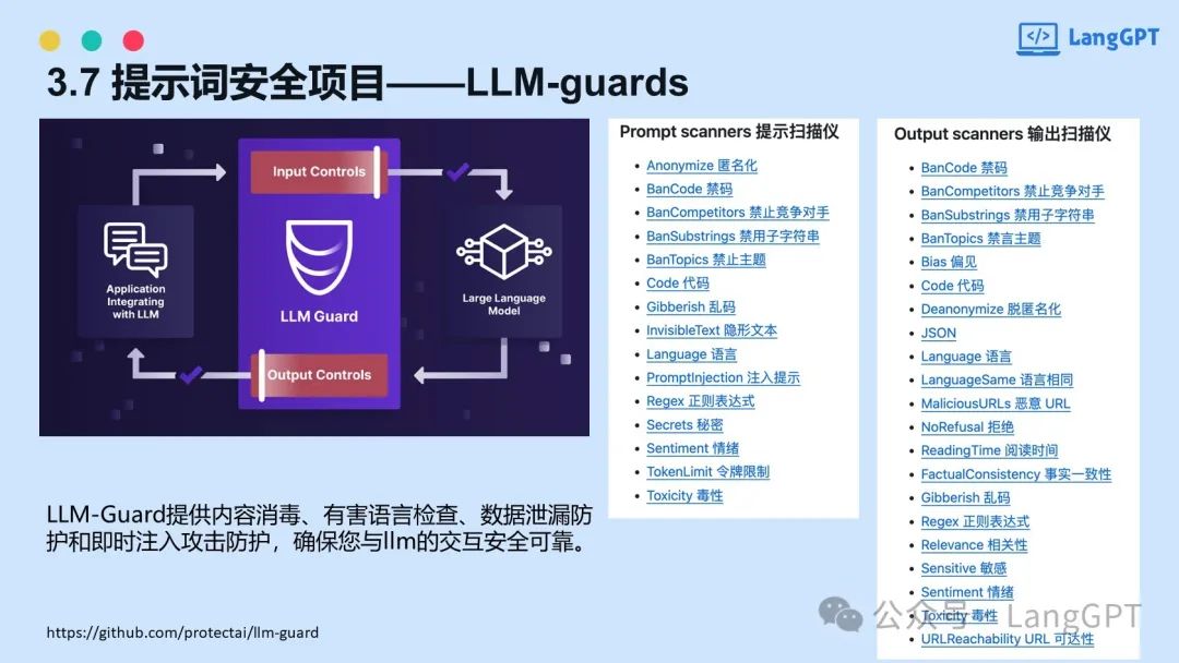 如果你要对输入输出都做一个仔细的检测的话,你可以参考一下LLM-guards 项目。它对于输入和输出都做了非常详细、细节的功能拆解。在实际使用过程中,可以按照我们的需求去自定义配置。