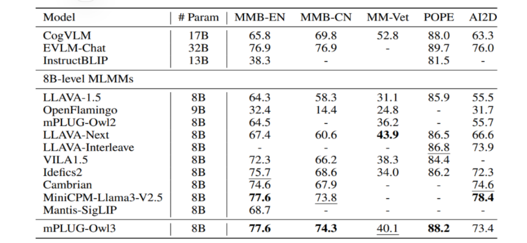 mPLUG - Owl3 在这些数据集上达到了先进水平。在 MMBench - EN 和 MMBench - CN 数据集上,mPLUG - Owl3 的表现尤为突出,在多个任务上的准确率都高于其他模型。在 MM - Vet 和 POPE 数据集上,mPLUG - Owl3 也取得了较好的成绩。然而,在 AI2D 数据集上,mPLUG - Owl3 未达到先进水平,这可能是由于该数据集的特殊性和复杂性。