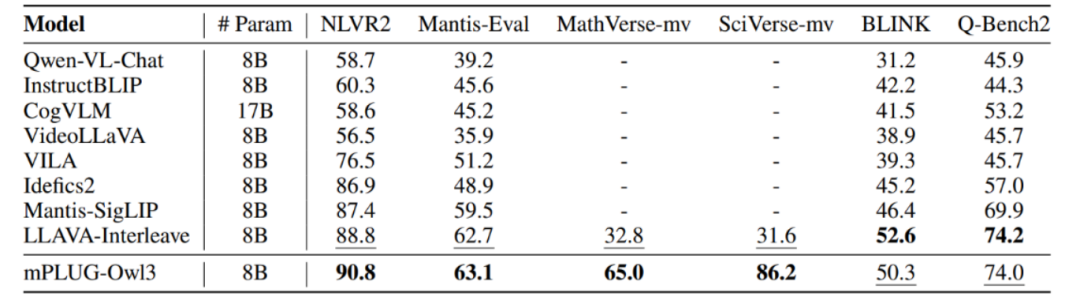 mPLUG - Owl3 在这些数据集上表现出色,优于其他 8B 参数级别的语言模型。在 VQAv2、OK - VQA 和 GQA 等数据集上,mPLUG - Owl3 的准确率明显高于其他模型。在 VizWizQA 数据集上,mPLUG - Owl3 也取得了较好的成绩。虽然在 TextVQA 上略低于 Idefics2,但仍超过其他 8B 模型。