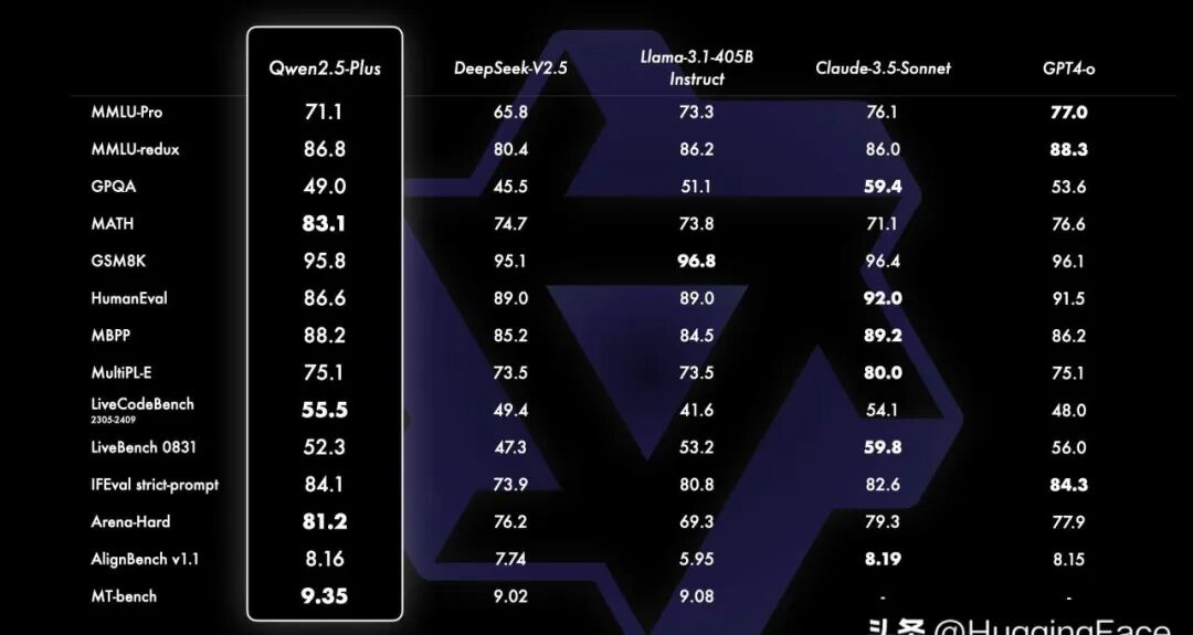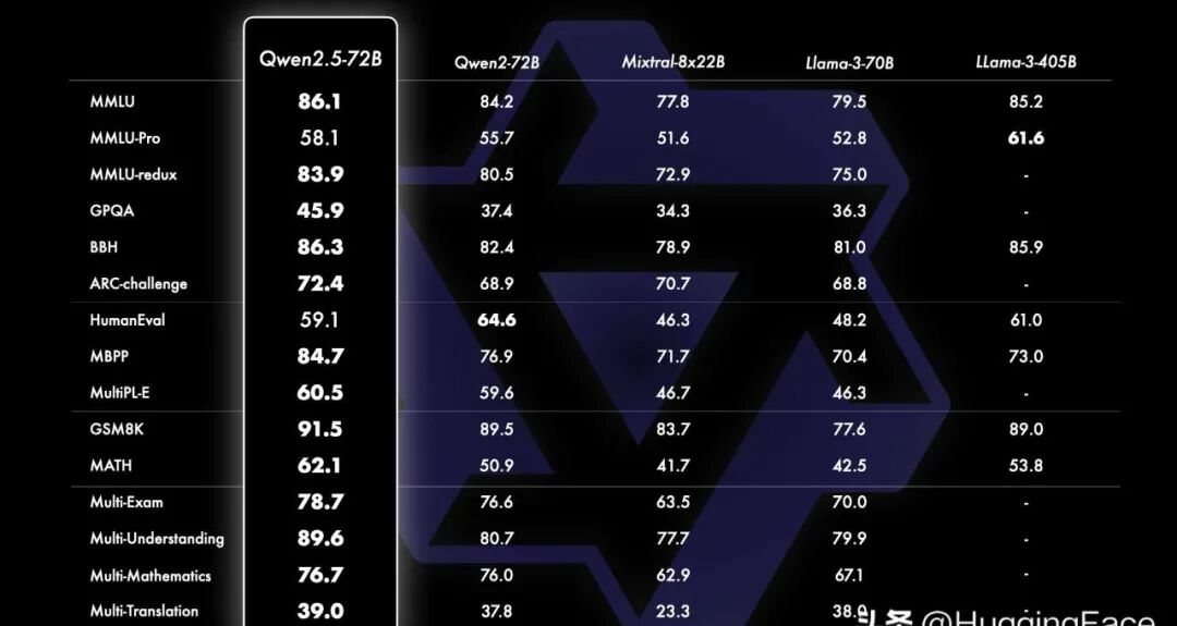 从基准测试来看,Qwen2.5-72B这一旗舰模型以其720亿参数的规模,在与其他开源模型如Llama-3.1-70B、Mistral-Large-V2等进行比较时表现优异。即便面对更大规模的Llama-3-405B,它也展现出了不俗的竞争力。这不仅证明了Qwen2.5在技术上的领先地位,也为未来的发展奠定了坚实的基础。