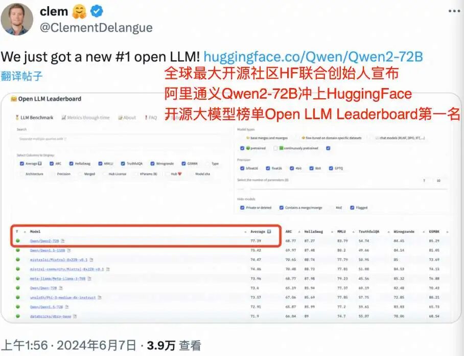 于是我就很期待阿里的通义千问能给我一个大大的惊喜,毕竟早在 2024年6月7日,阿里开源的 Qwen2 在发布后仅 2 小时,就登顶 HuggingFace 开源大模型榜单 Open LLM Leaderboard 的第一名,全球排名最高。