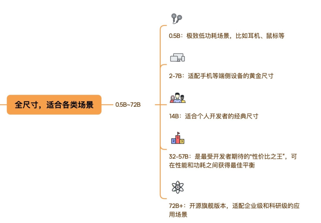 ①、提供 7 种参数规模的模型(从 0.5B 到 72B)可以说是全尺寸覆盖,0.5B 适合耳机、鼠标等轻量级外设,3-7B 适合手机等移动端设备,14B 适合个人开发者,72B 适合科研机构和企业。
