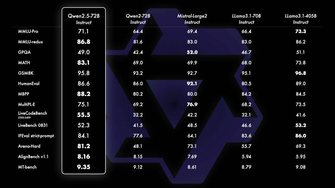 最新的开源模型 Qwen2.5-72B 在与 Llama-3.1-70B、Mistral-Large-V2、DeepSeek-V2.5 等进行比较的时候,也展现出了惊人的实力。