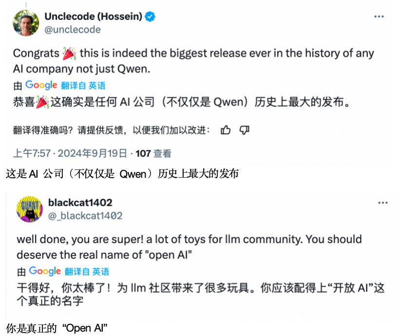 只能说阿里的技术底蕴还是在的,就连老外都忍不住夸赞了起来:这确实是 AI 公司历史上最大的发布、你是真正的 OpenAI、模型表现不错,感谢你为开源社区做出的贡献。