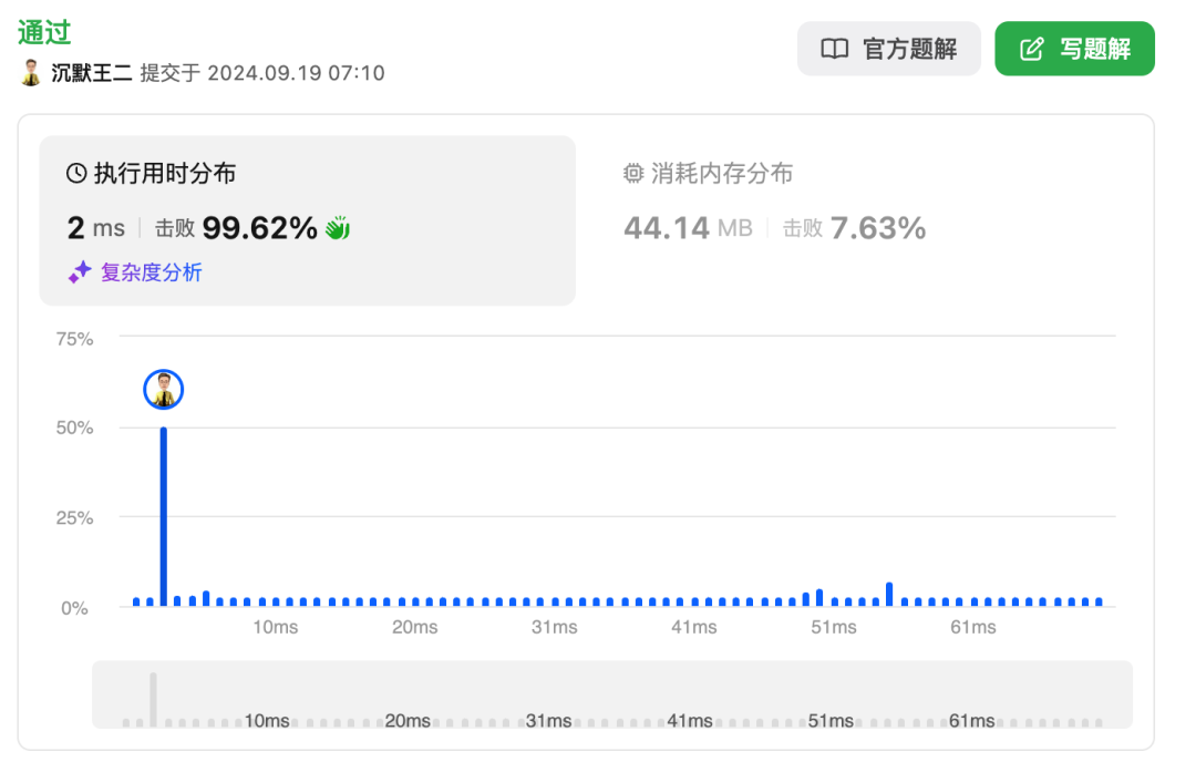 把代码粘贴到 LeetCode 中测试了一下题解效率。你别说,还挺高,直接击败了 99.62% 的选手。