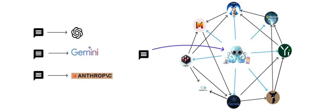Figure 1:从单一模型推理(使用万亿参数模型)到由 Octopus 模型协调的多节点协作的转变。该框架通过根据用户的查询选择最合适的专用模型并仅激活两个少于 10B 参数的模型 进行一步推理来优化推理过程。这里只展示了一个小图,但该框架可以支持一个大图。请参见 https://graph.nexa4ai.com/ 中的演示。相关工作