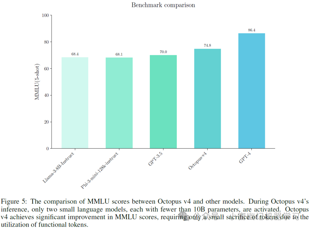 实验结果表明,Octopus v4框架使用约100(3B+8B)亿参数的模型,在MMLU基准测试上达到了最先进的性能。论文还讨论了在生产环境中部署此框架的系统设计考虑,包括无服务器架构和负载均衡。