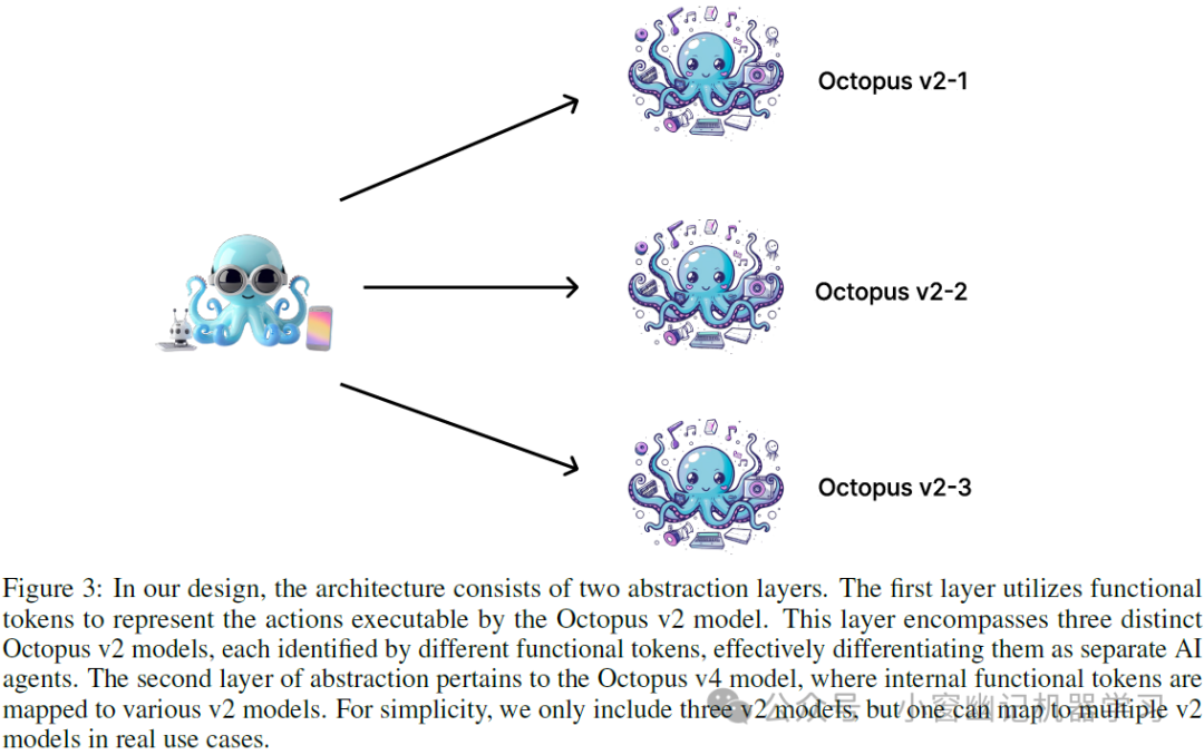 实际上,有两个抽象层次。首先,对于每个语言模型,可以应用功能token使其成为一个单独的AI Agent,可以进行单个函数调用。或者,单个节点/语言模型可以是像Llama3或Phi3这样的普通语言模型,可以进行问答、写作等操作。另一个抽象层次是还可以创建另一个Octopus v3模型来选择不同的节点。这两个抽象层次在Figure(3)中展示。
