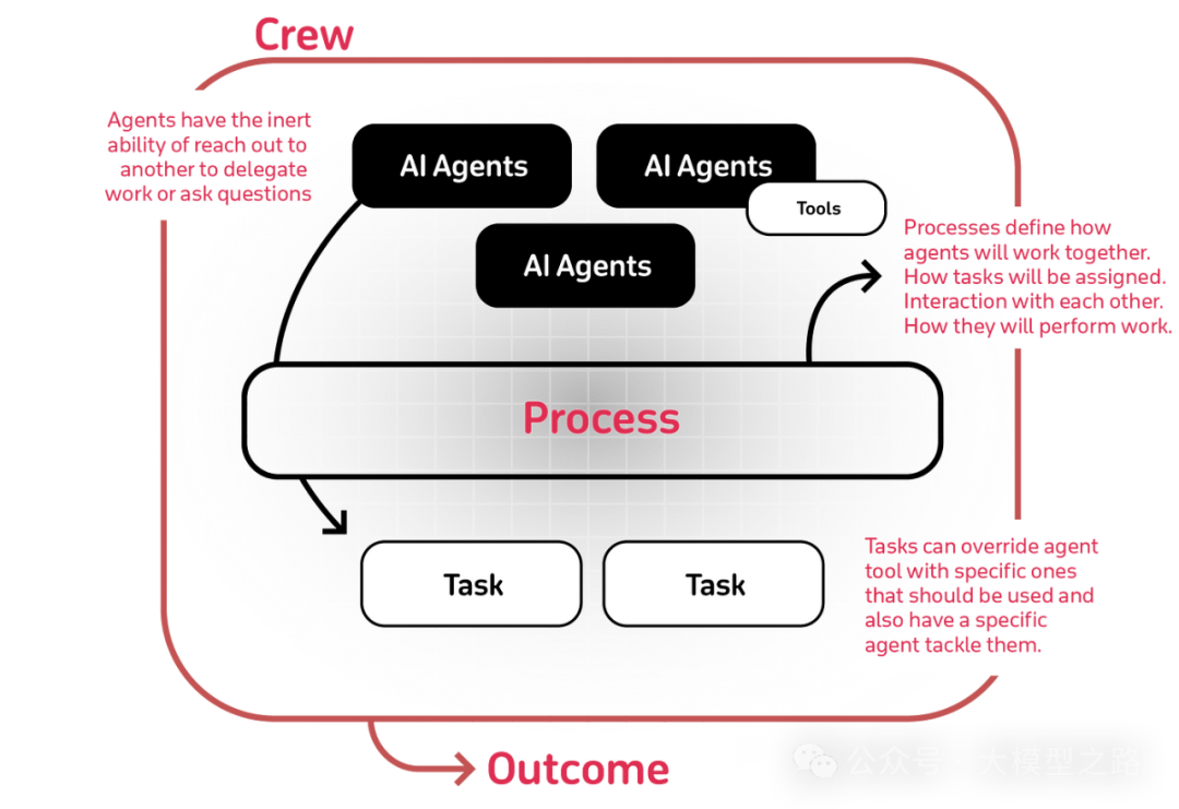 CrewAI的架构由多个关键组件构成,这些组件共同协作以实现多智能体系统的稳定运行。以下是对这些组件的详细解析: 工具(Tool):工具是智能体执行特定任务所需的辅助手段,如搜索引擎、文档加载器等。CrewAI基于LangChain构建,允许开发者使用LangChain提供的现有工具或自定义新工具,以满足不同任务的需求。 任务(Task):任务是智能体需要执行的具体工作单元。在CrewAI中,每个任务都被明确定义,并配备必要的工具和资源。智能体根据任务要求,选择合适的工具和方法来完成工作。 智能体(Agent):智能体是CrewAI框架中的核心单元,扮演着团队成员的角色。每个智能体都具备特定的角色、背景故事、目标和记忆。CrewAI中的智能体基于LangChain Agent进行扩展,增加了ReActSingleInputOutputParser以支持更复杂的角色扮演和上下文记忆功能。 团队(Crew):团队由多个智能体组成,共同协作以完成特定目标。在CrewAI中,团队成员之间的协作方式通过预定义的流程或策略进行组织和管理,确保任务能够有序、高效地执行。 流程(Process):流程定义了团队完成任务的策略和方式。CrewAI框架提供了三种基本流程策略:顺序执行(Sequential)、层次化执行(Hierarchical)和共识过程(Consensual,计划中)。这些策略允许开发者根据任务特性和需求选择合适的协作模式。