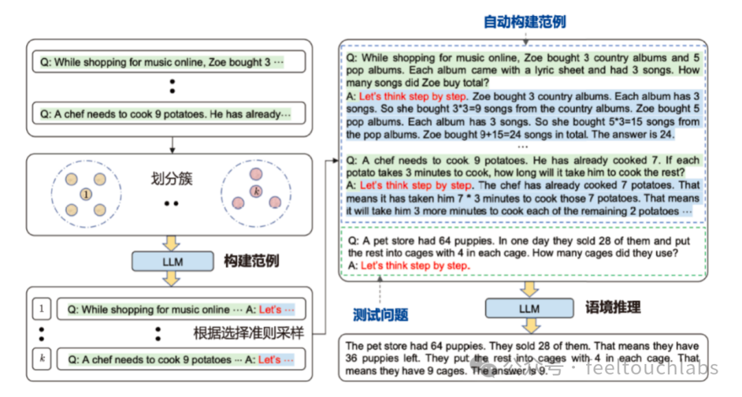 - (2)范例采样:从每个簇中选择一个代表性问题,并基于简单的启发式方法使用Zero-shotCoT 生成问题的推理链。
