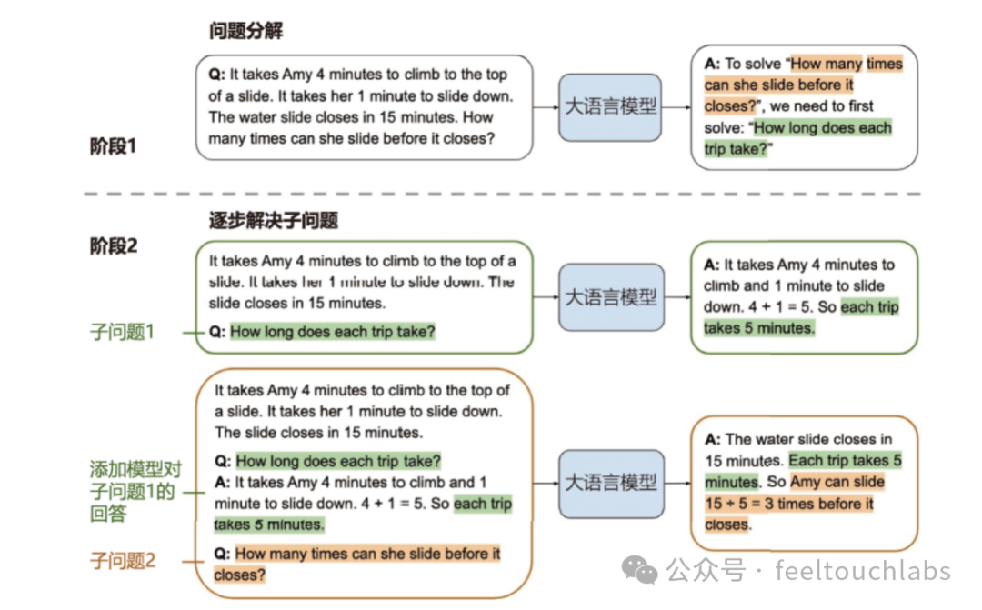 还有一些研究人员提出了对思维链提示的改进方法,例如从训练样本中选取推理最复杂的样本来形成示例样本,被称为Complex-CoT 也有研究者指出可以从问题角度考虑优化思维链提示,通过将复杂的、模糊的、低质量的问题优化为模型更易理解的、高质量的问题,进一步提升思维链提示的性能,这一方法被称为Self-Polish 2.2 由少至多提示(Least-to-Most Prompting)当面对复杂任务或问题时,人类通常倾向于将其转化为多个更容易解决的子任务/子问题,并逐一解决它们,得到最终想要的答案或者结果。这种能力就是通常所说的任务分解(Task Decomposition)能力。基于这种问题解决思路,研究人员们提出了由少至多提示(Least-to-Most Prompting)方法。这种方法试图利用大语言模型的规划能力,将复杂问题分解为一系列的子问题并依次解决它们。由少至多提示流程如图所示,主要包含两个阶段:问题分解阶段和逐步解决子问题阶段。在问题分解阶段中,模型的输入包括k×[原始问题,子问题列表] 的组合,以及要测试的原始问题;在逐步解决子问题阶段中,模型的输入包括k×[原始问题,m×(子问题,子答案)] 元组,以及要测试的原始问题和当前要解决的子问题。