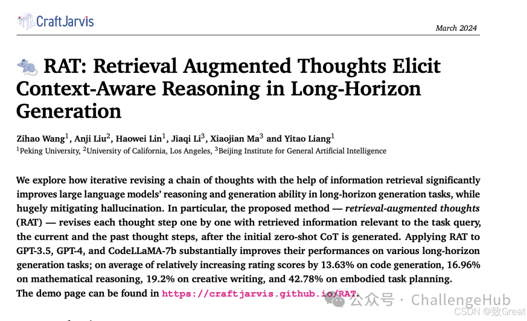 检索增强思维 (RAT) 是一种简单但有效的提示方法,它将思路链 (CoT) 提示与检索增强生成 (RAG) 相结合,以处理长窗口推理和生成问题。因此,LLM 生成零样本思维链 (CoT),并与 RAG 合并。使用这些想法作为询问,对其进行因果修正并逐步发展出答案。