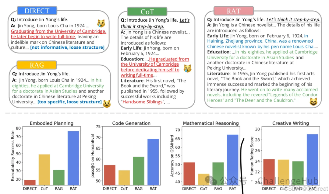 图 | 上:不同 LLM 推理方法在创意生成任务上的示例。红色文本表示 LLM 生成的文本中的错误或错觉,而绿色文本表示正确生成。没有 RAG 的方法通常会产生带有幻觉的不正确信息,经典 RAG 与结构松散的检索内容高度相关,而 RAT 生成的文本在准确性和完整性方面表现最佳。下:不同 LLM 推理方法在复杂的具身规划、数学推理、代码生成和创意生成任务上的定量性能比较。我们的 RAT 在所有任务上的表现都优于所有基线。