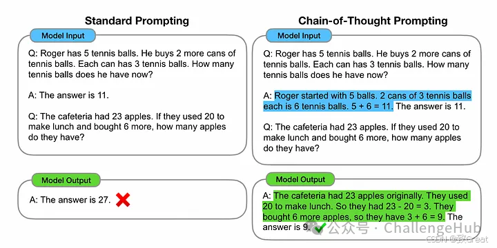CoT提示通过鼓励 LLM 解释他们的想法来解决这个问题。LLM不只是给出最终答案,而是通过将问题分解为更小的步骤来展示其“工作”。这就像在数学课上展示你的计算一样。