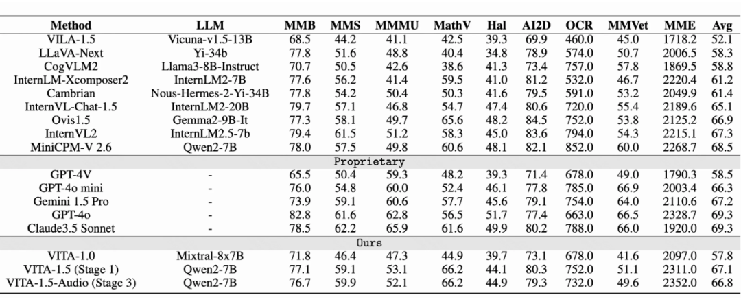 VITA-1.5 的一个亮点在于,在第二阶段(音频输入微调)和第三阶段(音频输出微调)训练后,VITA-1.5 几乎保留了其在第一阶段(视觉-语言训练)中的视觉-语言能力,尽量避免了因为引入语音信息导致多模态能力下降