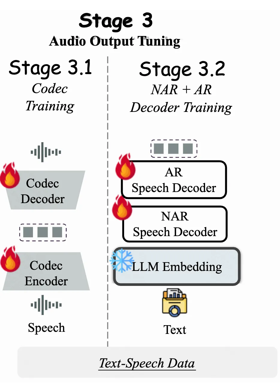 文本 Embedding 被送入非自回归语音解码器(NAR)以获得全局语义特征,然后这些特征被送入自回归语音解码器(AR),以预测相应的语音 token。LLM 在此阶段是完全冻结的,因此此前的多模态性能不受影响。