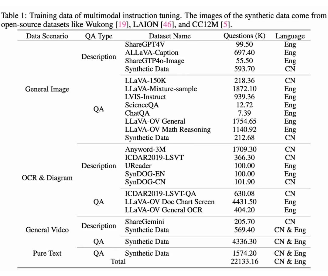 1.图像描述数据:包括 ShareGPT4V、ALLaVA-Caption、SharedGPT4o-Image 和合成数据,用于训练模型生成图像的描述性语言。