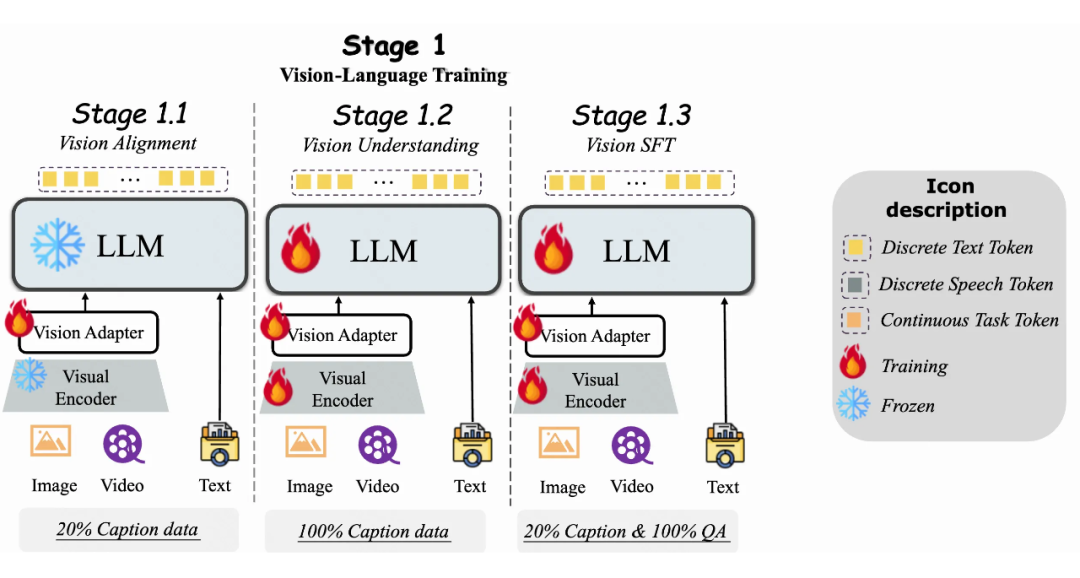 为了解决这个问题,设计了一个三阶段的训练策略。核心思想是逐步将不同模态引入模型,使其在增强新模态能力的同时,保持现有模态的能力。