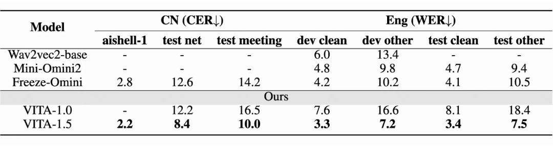 评估结果表明,VITA-1.5 在中文和英文 ASR 任务中均达到了领先的准确性。这表明 VITA-1.5 成功整合了先进的语音能力,用以支持多模态交互。