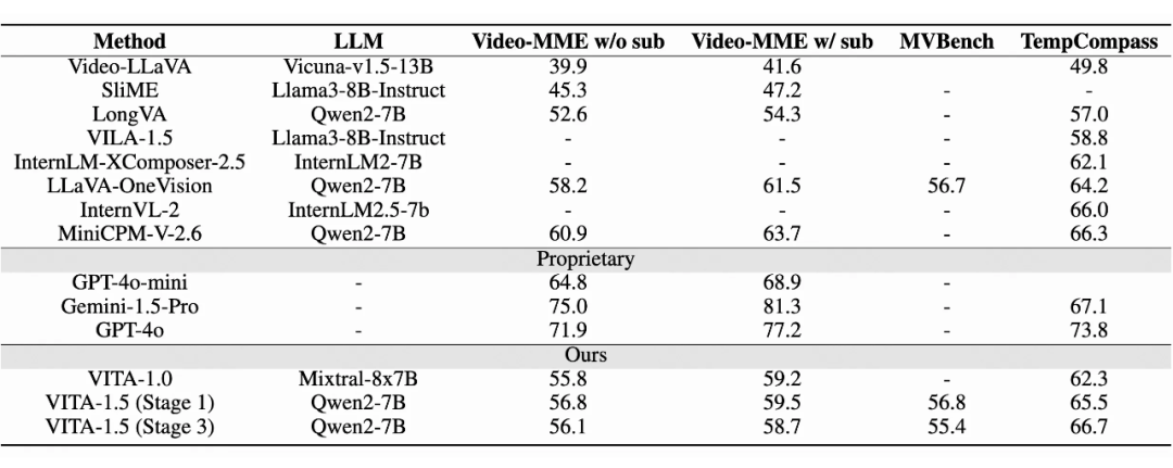上表展示了 VITA-1.5 在图像理解性能上的对比。经过三阶段训练后,VITA-1.5 的表现可与最先进的开源图像-语言模型媲美,显示了 VITA-1.5 在图像-语言任务中的强大能力。在视频理解评估中,VITA-1.5 的表现与顶尖开源模型相当。但与私有模型仍有较大差距,这表明 VITA-1.5 在视频理解方面仍有较大的改进空间和潜力。