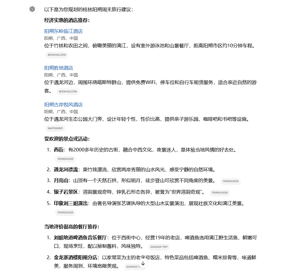 例如:“帮我规划一个周末去桂林阳朔的旅行。首先推荐旅游地三家经济实惠的酒店。然后,列出五个受欢迎的景点或活动。最后,推荐两家当地评价很高的餐厅。请将以上内容用表格形式呈现。”