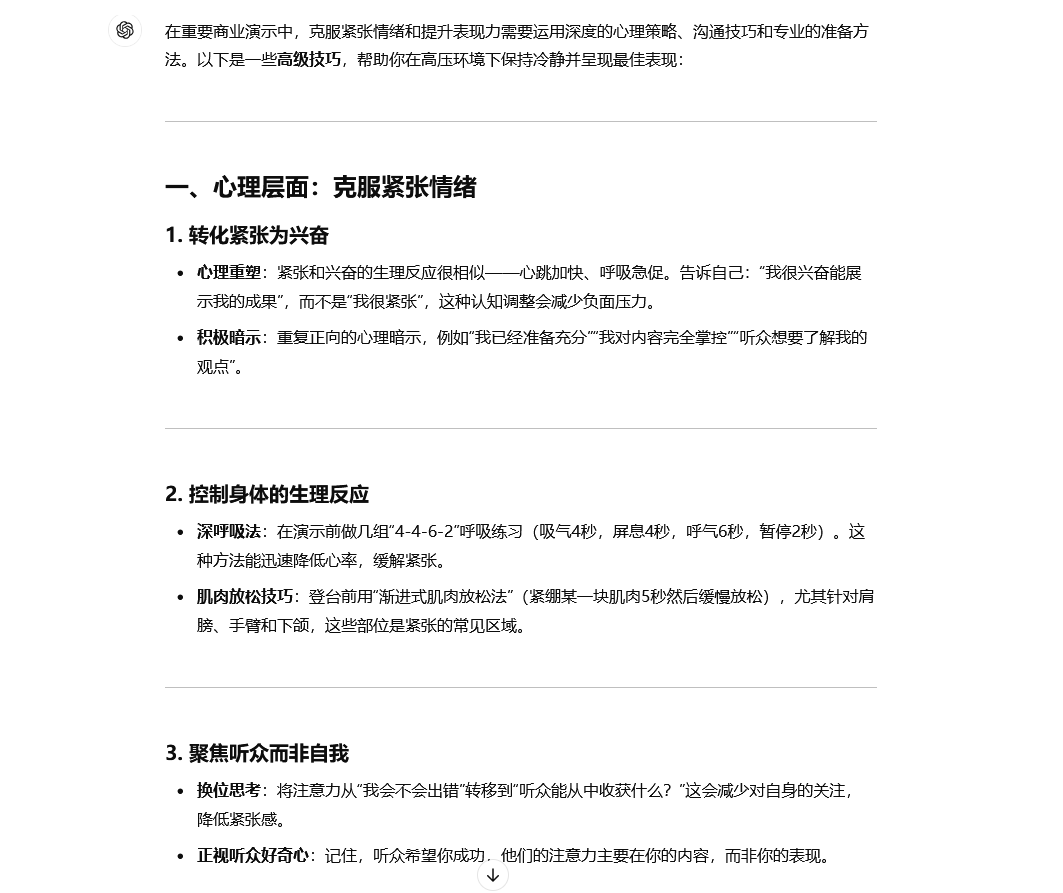 例如,你问 AI:“公开演讲的技巧有哪些?” 如果它给了你一些基础建议,比如“多练习”“保持自信”等,但你需要的是更专业的内容,你可以改进提示:“给一些高级技巧,专门针对在重要商业演示时如何克服紧张情绪和提升表现力。”