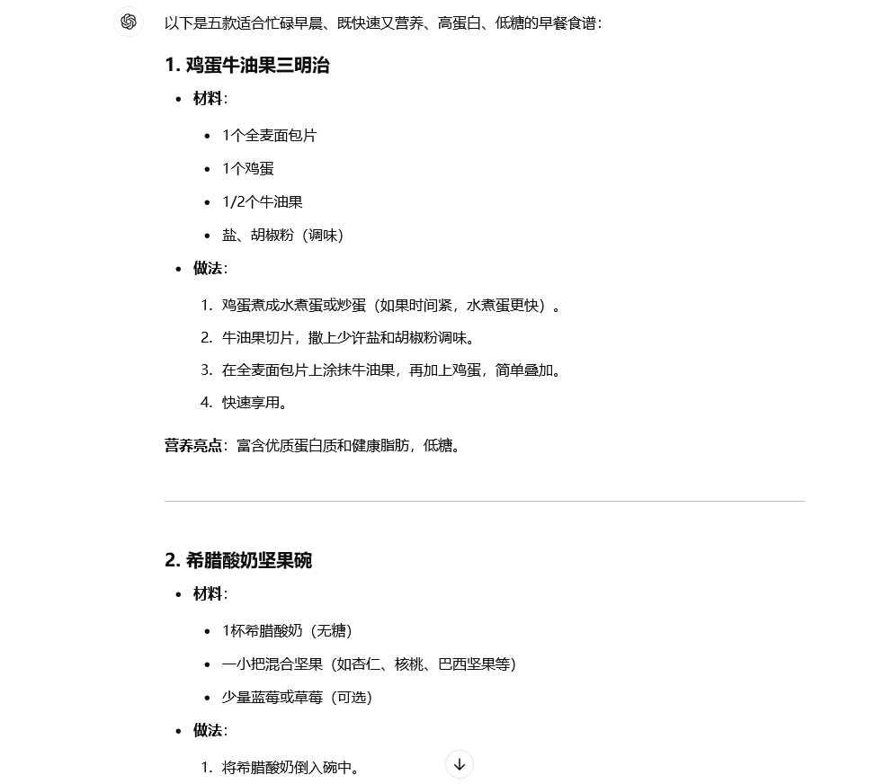 例如,你想问关于健康早餐的创意,不要只说“有什么健康早餐推荐?” 这样的问题过于笼统。可以试着加入关键词,比如“快捷”“营养”“高蛋白”“低糖”等。